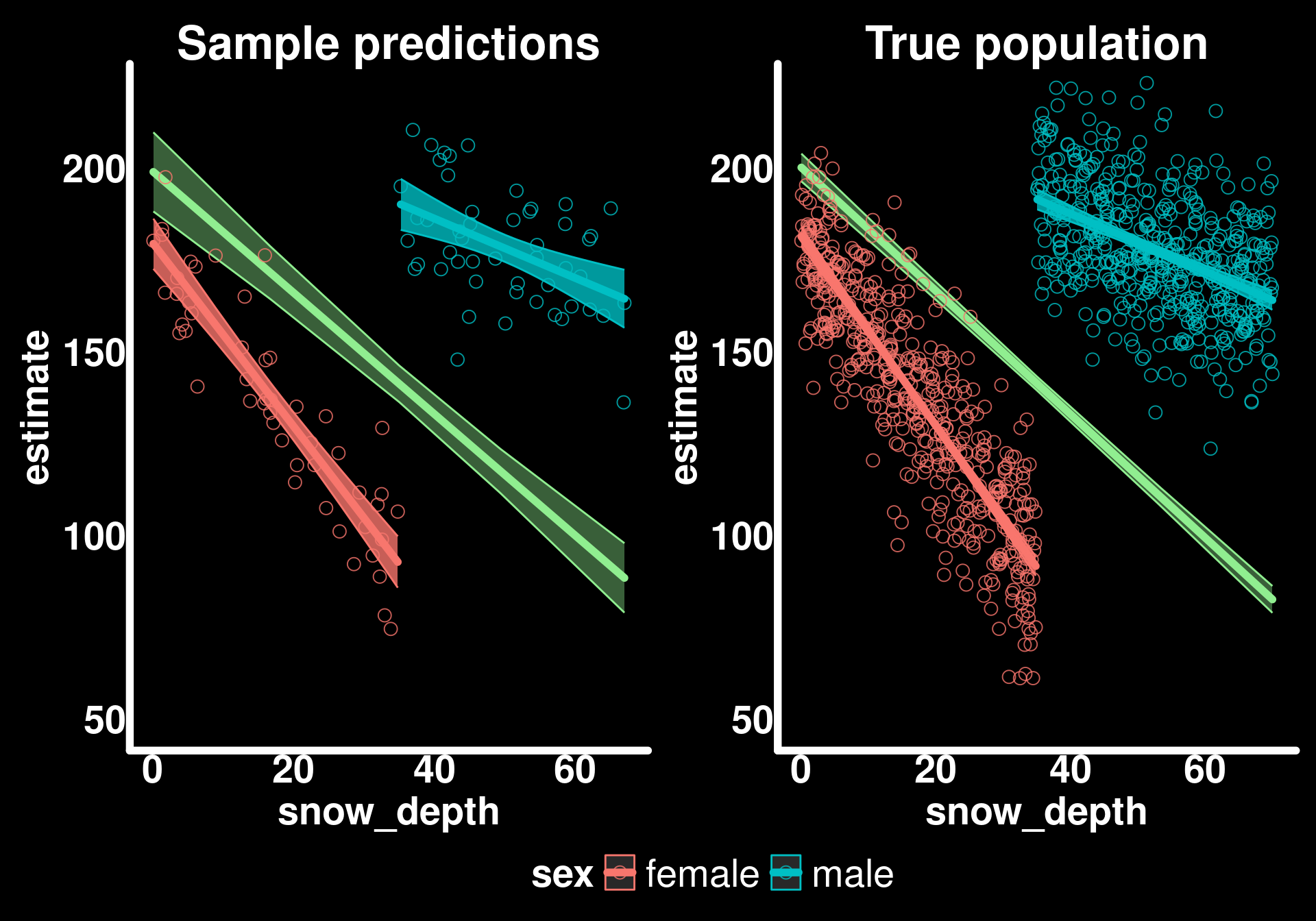 mod_mass_true <- glmmTMB(weight ~ sex * snow_depth, data = bighorn_population, family = gaussian())We will use this model to compare with two different sampling scenarios later on.