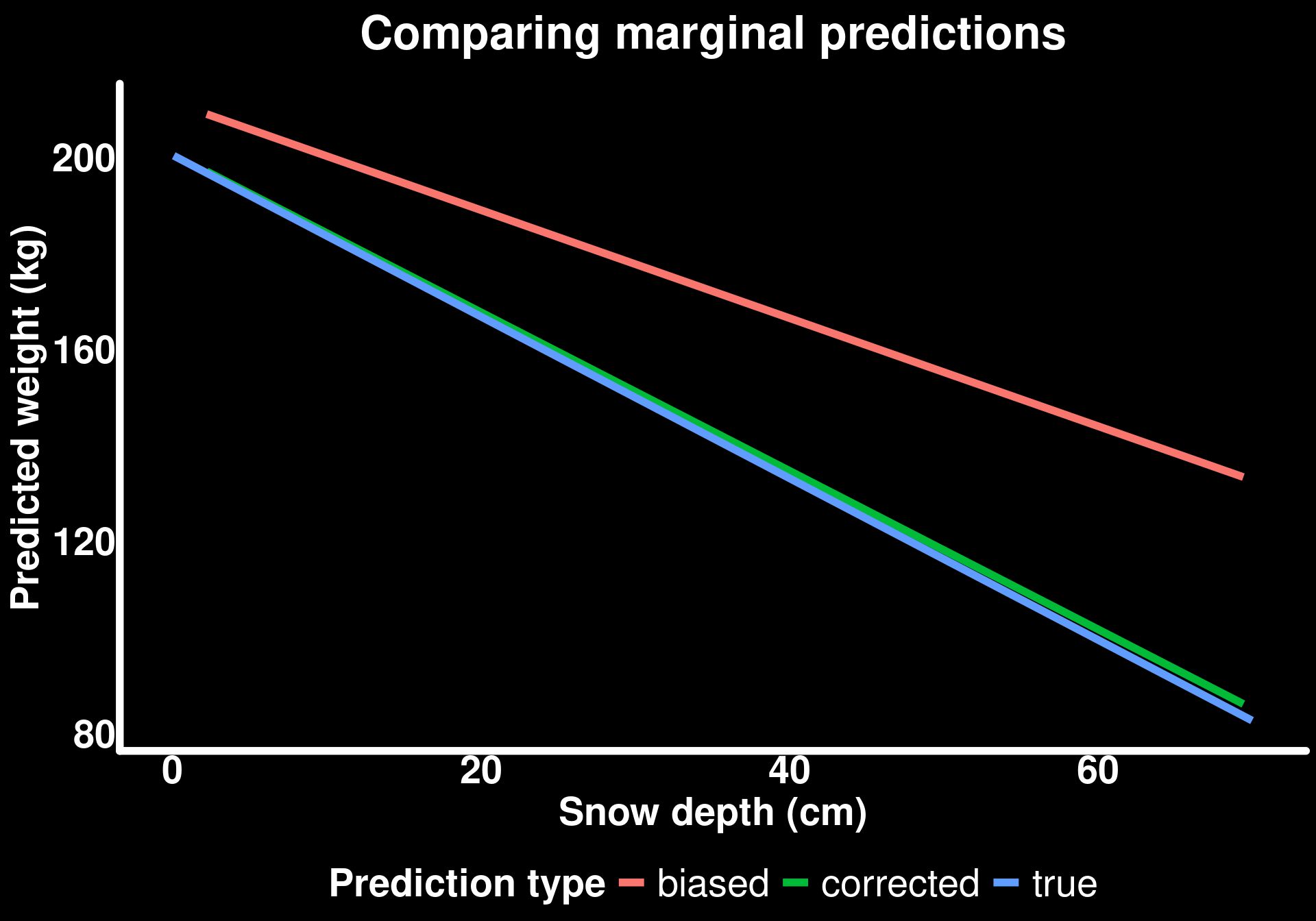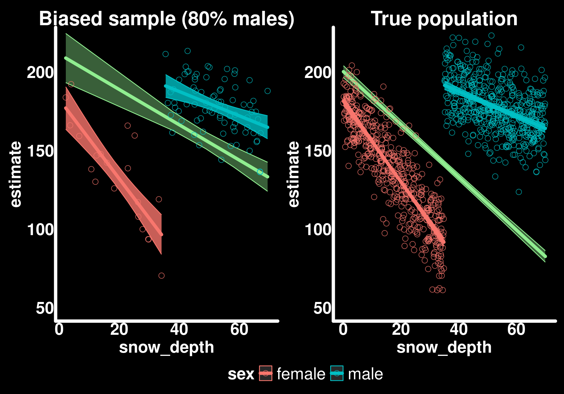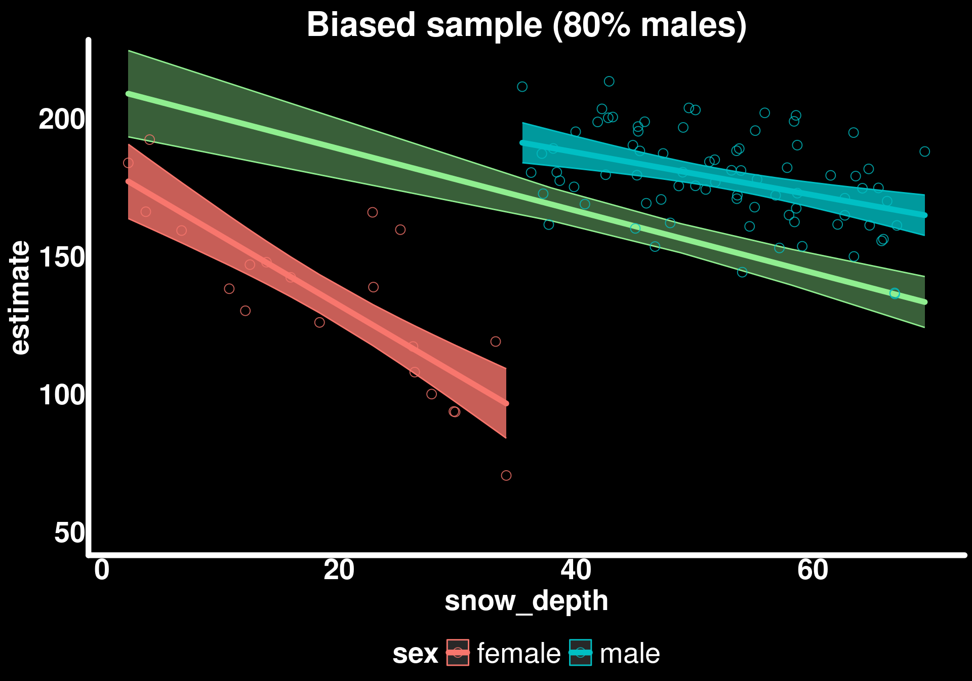 In this case, since males have a weaker snow depth effect (-0.8 kg/cm) than females (-2.5 kg/cm), oversampling males causes our marginal slope to be less steep than the true population average.