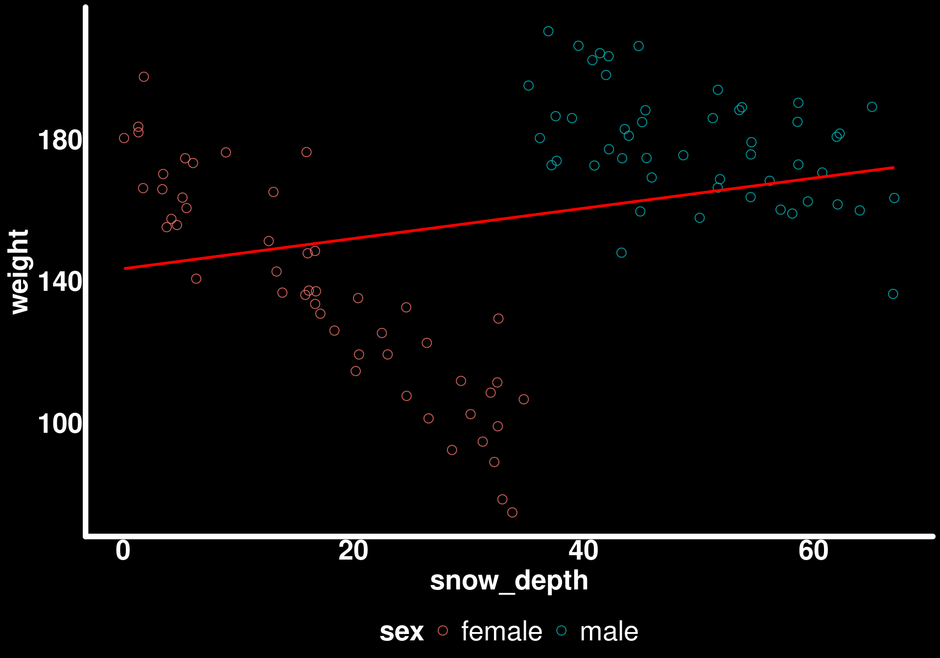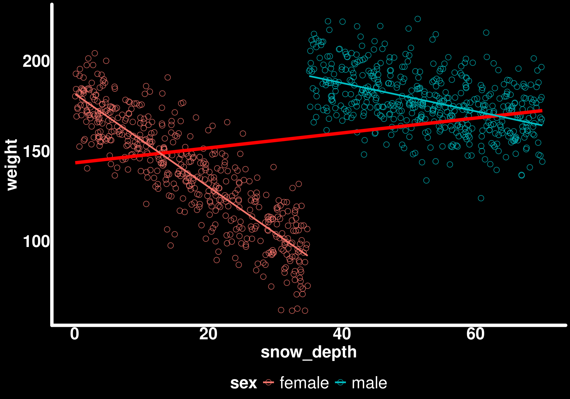 This happens because sex is a confounding variable that is associated with both snow depth (males experience more snow) and weight (males are heavier). When we pool the data, we’re essentially comparing the high-snow males (heavy) to the low-snow females (lighter), which creates an artifactual positive correlation.